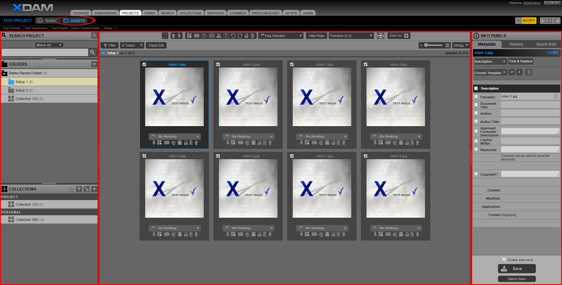 | • | Center panel is where you view the assets. It also contains all the tools you have access to in order to send, download, rename, etc. the assets. |