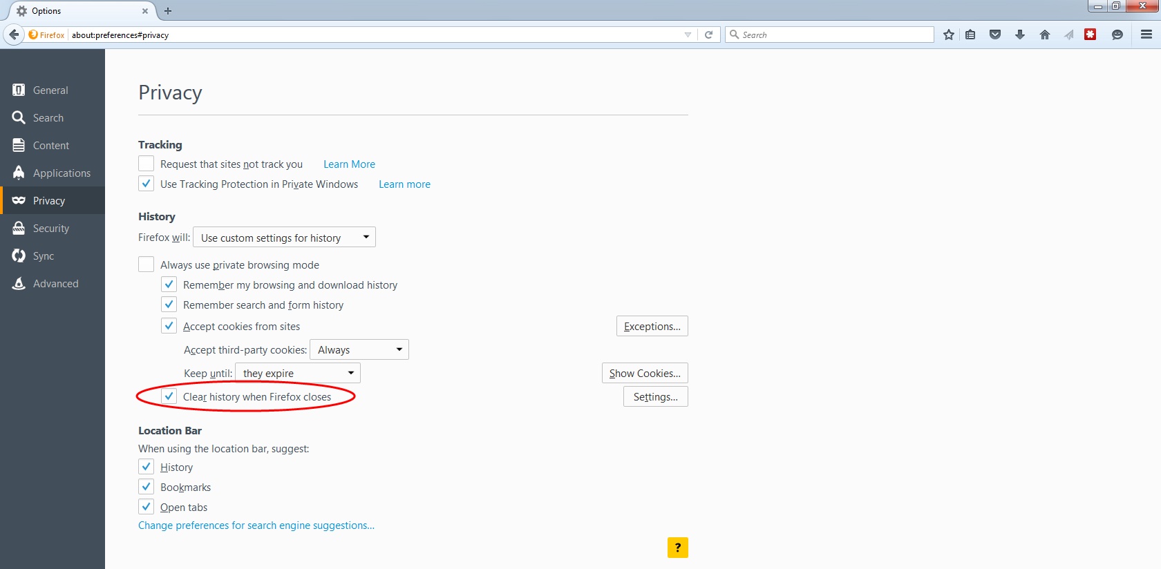 5. Beside "Clear history when Firefox closes", click the Settings... button. The settings for Clearing History window will open.