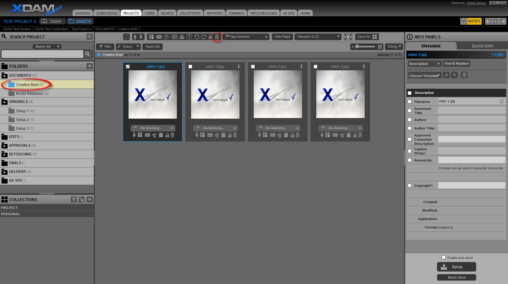 A. If a Subfolder is selected, click the Trashbin icon to delete an asset(s).