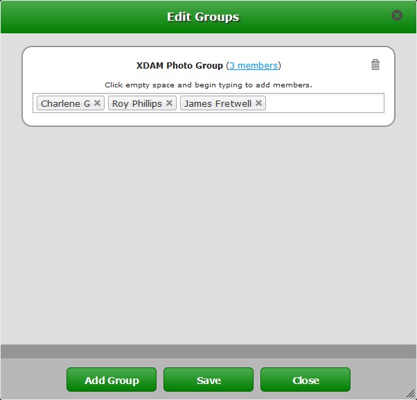| • | Click the white area provided and either begin to type the name of the User to add to your group or select them from the drop down menu. Select the Save button to complete the new group and member listing. |