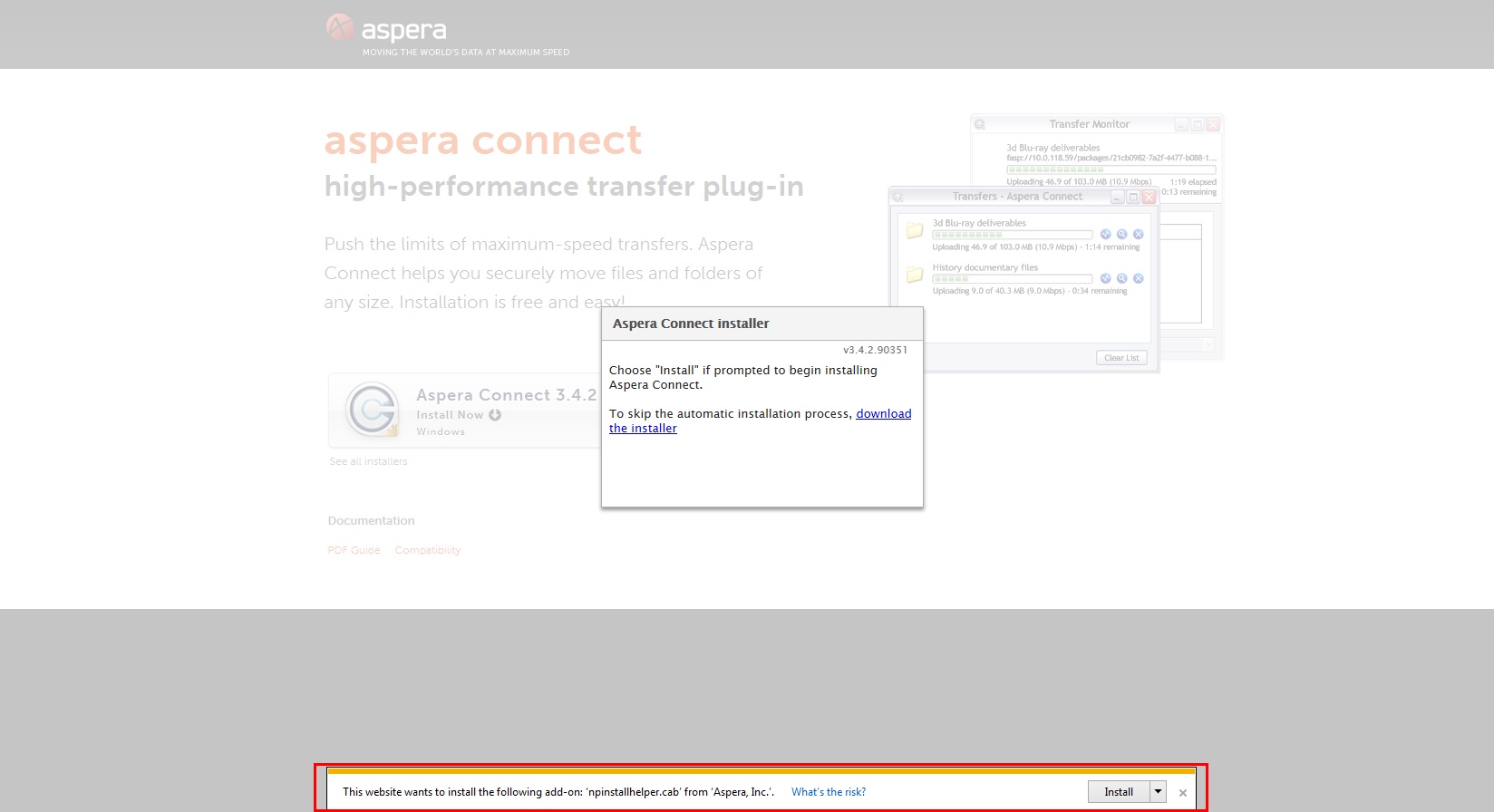 If the Aspera Upload/Download tool is not yet installed in your computer, the link to install will be available in the pop-up window.
