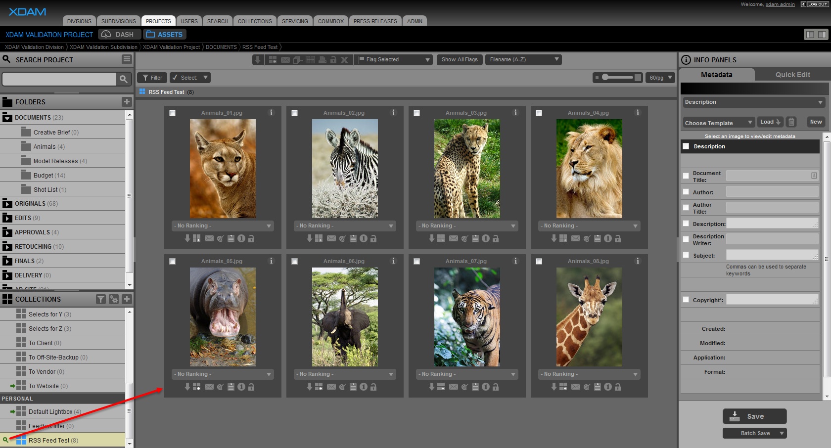 After clicking Save, note that a magnifying glass icon is now seen beside the RSS Feed Test Collection. This icon denotes that we have set up a Smart Search and assets with "Animals" is now being fed into the Collection: