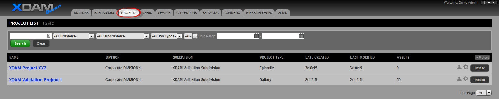 The Projects tab is where your projects reside from within your specific Divisions and Teams.