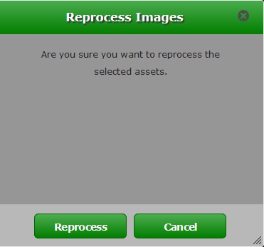 | • | After selecting the tool, you will get a confirmation box, simply click “Reprocess” and the job will be queued then the dialog will disappear once this is complete. |