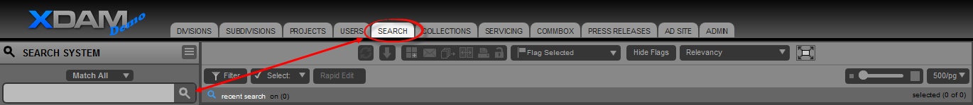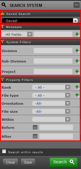 a. Click on the icon beside the Search System. You will see four window panes; Saved Search, Metadata, System Filters and Property Filters.