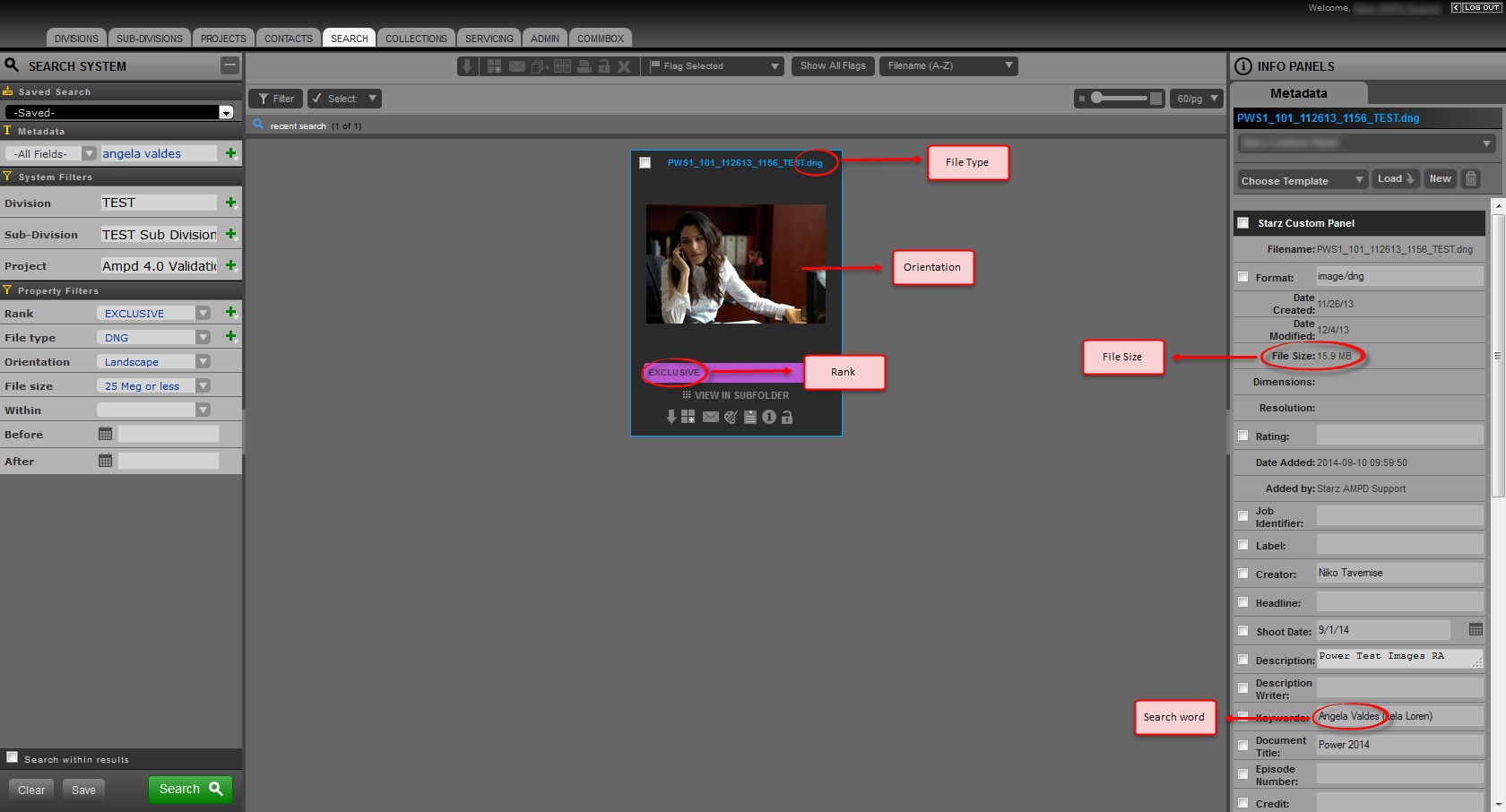 Under Simple Search, the system will search on all metadata fields of the assets in XDAM. Note that in our example, the system located our search word in the Keywords field.