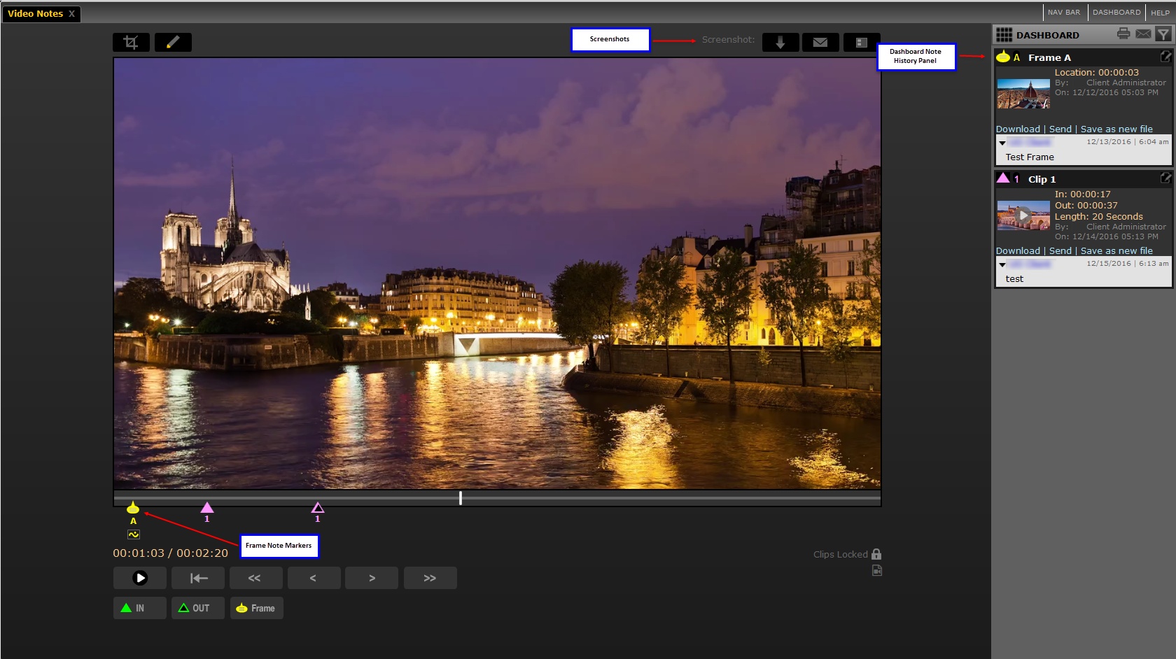 | • | Frame Note Markers: Frame specific note markers and representative freeze frames - In/Out and Frame Notes |